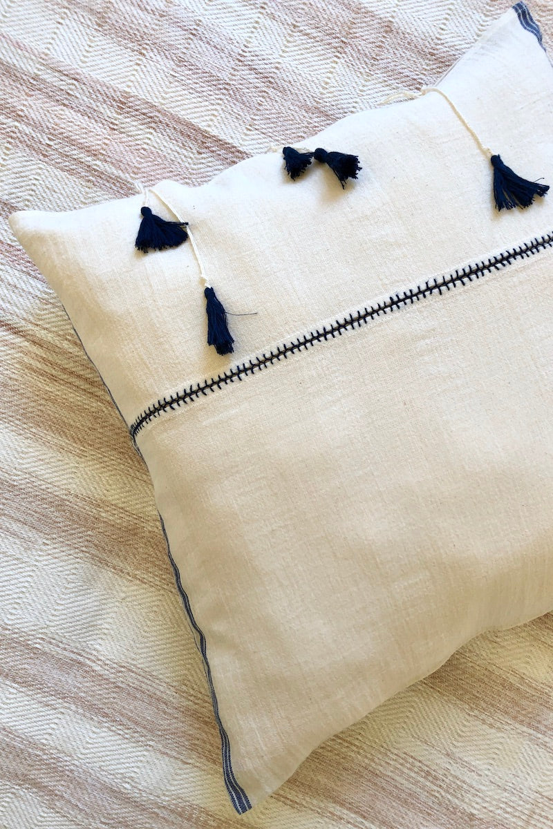 Our Şile bezi pillows are created by a cooperative of women in a multi-step process that begins with spinning GOTS certified organic cotton fibers 1200 times to make thread. The handloomed cotton fabric is then boiled in floured water, washed in seawater and dried on the quartz sand beaches of the Black Sea. Finally, the stitching and crochet details of the pillowcases are likewise done by hand.